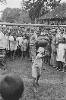 Schoolkinderen staan klaar voor ochtendgymastiek op een alun-alun. Tussen hen in grazen geiten
