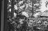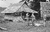 Kendari (Celebes): Opbouw in Oost-Indonesie. Een opperman brengt de houten dakpannen naar het dak, waar ze worden vastgespijkerd.
