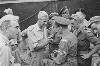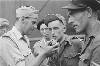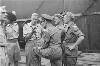 Aankomst M.S. Sloterdijk. Luitenant met microfoon. Voor hem staat een sergeant met het onderscheidingsteken "Friesland"