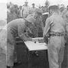luitenant-gouverneur-generaal H.J. van Mook tekent met een ganzenveer een oorkonde. Ernaast ligt een koker.