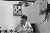 Prinses Margriet Hospitaal te Batavia. Bloedbank. Verpleegster zit achter bureau en telefoneert