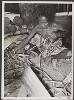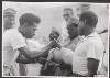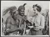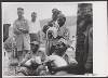 In de bergkampon Erepakirida, waar een varkensfeest gehouden werd. Ekari-politiemensen van de politiepost Enarotali aan de Wisselmeren in gesprek met enkele vrienden. De huit op de achtergrond werd gemaakt van tentzeil en boomstammetjes ten behoeve van de mannelijke leden van het gezelschap. Voor de vrouwen was een echte kampeertent opgericht