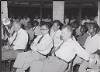 Verkiezingen voor de Nieuw-Guinea Raad op de Schouteneilanden. Na het stemmen speelt het fluitorkest van kampon Madori.