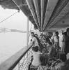 Een zieke wordt de lift van het MS Oranje binnen gedragen