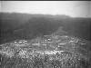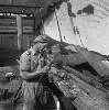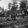 Hollandia. Een halfnaakte man oogst iets. Om hem heen staat een groep mannen met ontbloot bovenlijf