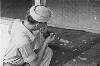 Soemedang: Zuiveringsacties van 3-4 R.I. Een militair poseert met helm en regenjas in een tropische regenbui