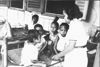 The Netherlands Indies Civil Administration at Ambon. Outside one of the NICA kitchens at Ambon. Prepared food in handed to the waiting queue outside through holes in the wall of the cookhouse, to ensure fairness in the distribution. Nica has a large task, for about 64,000 Ambonese depend on the supplies given them by the administration. NI 3505