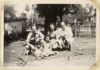 Groepsportret van twee mannen en vier vrouwen in een tuin tijdens het nuttigen van een koude drank