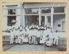 Een zwart-wit glasdia van een beekje te Purworejo (Poerworedjo). Op de oevers twee Europese mannen en een Indonesische bediende.Rechtsonder een rond stickertje van de heer Kooij zelf met opschrift: 'Apn'.