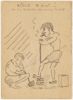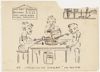 Tekening in pen en potlood van drie mannen die, zittend aan een tafel, met behulp van een tang, een zaag en een boor een blik zalm openen. Aan de muur hangt een bordje: "Ons niet hinderen. Rusturen 8-10 v.m, 12 - 4 n.m. Feest-, zon- en andere dagen gesloten."