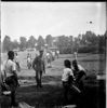 Een zwart-wit glasnegatief van een aantal militairen in hun geïmproviseerde bivak tijdens de opmars in Boni. Mogelijk is de militair in de sarong, wit hemd en pet met insigne Kapitein Kooij.