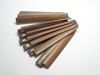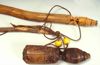 Drie klokvormige noten, boven elkaar geregen aan een koordje van ineengedraaide plantenvezel.