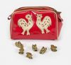 Een bikkelspel bestaande uit zes koperkleurige metalen bikkels opgeborgen in een rood kunststoffen handtasje met rits en hengsel. Op het tasje applicatiewerk van een wit leren kip en haan. Het bikkelspel is als sinterklaascadeau voor Arendje dor haar zus Henny gekocht.