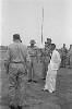 Waaier in zilver- en goudborduursel met roze kraaltjes en lovertjes op paars katoen. Tegengevoerd met fel roze damast weefsel. Rondom geel kunstzijde ruche met ingeweven motieven. Het handvat is ook omkleed met felroze. Aan het uiteinde van het handvat een groen wollen geknoopt koordje met twee groen/oranje pompoentjes van wol. Motieven: bloemen en ranken.
