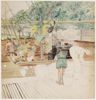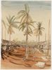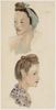 Een portret van een vrouw met rode kralenketting in aquarel. Opschrift: "Madelon".