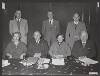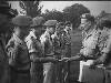Een schoolplaat met een zwart-wit foto in een wit kader "98. Rijstcultuur. Het oogsten.” Linksonder: "Kleynenberg & Co, Haarlem.”<br>Een blik op een rijstveldengebied. Arbeiders en toezichthouders poseren in een rijstveld dat geoogst wordt. De geoogste rijst wordt gebundeld.<br>Bij de schoolplaten hebben een aantal hoogleraren en deskundigen uit die tijd toelichtende teksten geschreven. De toelichtende tekst bij deze afbeelding is van Dr. J. Dekker: "Cultures. Rijst Plaat 96 Beplanten van een rijstveld. Plaat 97 Rijstcultuur, Het stampen van de padi. Plaat 98 Rijstcultuur. Het oogsten. Van alle voedingsgewassen der aarde bezitten de granen verreweg de grootste beteekenis en van deze granen zijn er twee van overwegend belang, dat zijn de tarwe voor de gematigde luchtstreken en de rijst voor de tropische en de subtropische gebieden. Duidelijker misschien dan ergens anders komt het in ons Indië uit, welken invloed de rijstplant op land en volk heeft, waar zij het hoofdvoedsel der bevolking levert en in tal van bebouwde streken het karakter van het landschap beheerscht. Het is hier niet de plaats, om uitvoerig te zijn over de rol, die de rijstplant vervult in het intieme leven van de bewoners van Indië van uiteenloopenden aard, ook niet om te vertellen, hoe de Javaan zich het ontstaan -der eerste rijstplanten denkt en hoe hij door verschillende gebruiken bij de rijstcultuur aan die gedachte uiting geeft (zie hiervoor het hoofdstuk Rijst (door J. J. Paerels) in Van Gorkom's ‘Oost-Indische Cultures’, nieuwe uitgave). Evenals tarwe, rogge, gerst, enz. behoort ook de rijstplant tot de plantenfamilie der grassen, maar onderscheidt zich van de meeste andere grassen reeds door het bezit van een dubbel aantal meeldraden, n.l. zes. Een ander, belangrijker onderscheid met de granen van de gematigde zone openbaart zich in de cultuur. De rijst is n.l. een moerasplant en groeit dus het best op terreinen, die onder water gezet zijn, dus kunstmatig in een moeras kunnen worden veranderd. Inderdaad geschiedt in Indië de rijstcultuur voor verreweg het grootste gedeelte op zulke bevloeide velden (sawah's), die hun water op verschillende wijze kunnen ontvangen, n.l. door den regen, maar meestal door irrigatie, d.i. kunstmatige bevloeiing. Op plaat 5 en 6 ziet men groote hellingen van het gebergte in een onnoemelijk aantal terrasjes verdeeld, die van uit eenzelfde rivier onder water gehouden kunnen worden. Langzaam stroomt dan het water van het eene terras op het onmiddellijk lager gelegen gedeelte. Het vruchtbare slib, dat de rivieren van boven af meevoerden, bezinkt hier en is met de plantenvoedingsstoffen, die in het water opgelost worden aangevoerd, oorzaak, dat een voortzetting dezer cultuur gedurende eeuwen op dezelfde velden mogelijk bleek. Eerbied afdwingend is de wijze, waarop sommige stammen (Bali) de irrigatiewerken zonder kennis van Westersche techniek tot een groote hoogte wisten op te voeren. De resultaten van de rijstteelt houden met de ontwikkeling van de irrigatie-techniek vrijwel gelijken tred; het kan dus geen verwondering baren, dat deze in Bali beter zijn dan in andere streken en dat de Nederlandsche regeering in de laatste jaren veel tot verbetering der irrigatiewerken doet. Deze groot-cultuur is hoofdzakelijk een volkscultuur en wordt op Java nog dikwijls communaal gedreven. In dat geval zijn gronden bezit van een dessa en deze worden voor een bepaalden tijd onder de rechthebbenden verdeeld, terwijl ieder gezin dan zijn eigen veld bebouwt. Waar de rijstcultuur op enkele Europeesche ondernemingen in het groot wordt gedreven, geschiedt dit mede op inlandsche wijze. Men mag uit het bovenstaande niet afleiden, dat alle rijst in Indië op sawah's geteeld wordt: naast den zoogenaamden natten rijstbouw heeft men ook den drogen. De droge rijstbouw is op Sumatra lang niet zeldzaam; hiertoe wordt een stuk woeste grond ontgonnen en op den vrijgekomen vruchtbaren boschgrond zonder bevloeiing rijst uitgezaaid. Na 1 à 3 oogsten wordt dit terrein (een ‘ladang’) weer verlaten en in lange jaren niet in cultuur genomen. Bij dezen ladangbouw wordt uit den aard der zaak slechts een weinig productief gebruik van den bodem gemaakt, stellig veel minder dan bij den sawahbouw. Doch hiertoe is zeer veel meer arbeid noodig, om tot goede oogsten te komen, waterleidingen moeten worden aangelegd, terrassen gevormd, terwijl voor het uitplanten de bodem min of meer wordt bewerkt, eerst met den ploeg en later meestal nog met de patjol, een werktuig, dat onze spade vervangen moet, doch waarbij het blad loodrecht staat op den steel. Een gedeelte van het veld wordt bestemd voor de kweekbedden, waarin het rijstzaad (padi) wordt uitgelegd. Zijn hier de rijstplanten tot eene lengte van ongeveer 1/4 Meter uitgegroeid, dan wordt het tijd voor de overplanting. De planten worden dan uit de kweekbedden getrokken, in bossen gebonden en, na getopt te zijn, gebracht naar de sawah, waarvoor zij bestemd zijn. Daar zijn dan meestal een ferm aantal vrouwen ijverig doende, om de planten in den vollen grond te brengen (zie plaat No. 96). Met een bosje jonge rijstplanten (‘bibit’) in de linkerhand, planten zij 1 tot 3 plantjes op vrij gelijke afstanden van elkaar in de modder. Een regelmatig plantverband is daarbij gewoonlijk niet te herkennen. Na enkele dagen richten de toppen van de plantjes zich weer op, zij groeien uit en vormen rijststengels zooals het suikerriet (uitstoelen). Een paar malen wordt de sawah gewied en na circa 3 maanden staat de sawah in bloei. De tijd van het rijpen is voor alle varieteiten niet gelijk, doch na 4 tot 7 maanden is de oogsttijd aangebroken. Tijdens het rijpen wordt natuurlijk gewaakt tegen de schade, die vogels aan den oogst kunnen toebrengen. Vogelverschrikkers in velerlei vorm zijn daartoe in gebruik. Bij den oogst (plaat 98) komt weer de vrouw in het veld en men kan zich moeilijk een aardiger en kleurrijker tafereel denken, dan een rijp padiveld, waarin de dorpsschoonen in haar kleuri