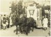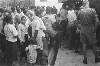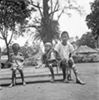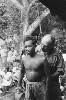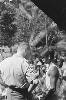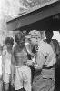 Een aquarel gemaakt op de achterkant van een Japanse briefkaart van vier mannen, op de rug gezien afgebeeld, die een aan de muur hangende menulijst bestuderen. Op de lijst de tekst: "Menu 12-2-'45 ontbijt 400 cc pap. lunch 1/5 brood (2 ons), diner 200 gr rijst, 200 cc soep, lobak, rum (-)". Onder de lijst staat een gamel. Rechts van de lijst hangt een bordje met de tekst: "Blok 1-6-7 200 gram oebi". Hieronder staat een ...