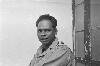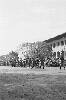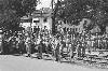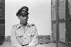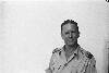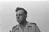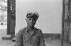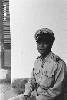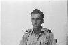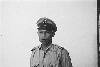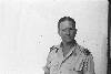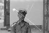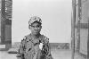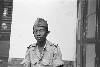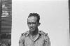 Een epaulet van groene uniformstof met daarop vastgenaaid het koperkleurig metalen embleem van een jachthoorn (KNIL) en dito knoop met daarop de Hollandse Leeuw (eveneens KNIL). Het epaulet heeft een gerafelde rand.
