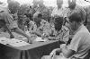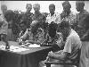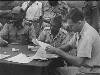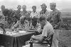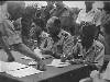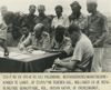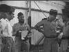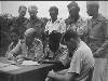 Lahat bij Palembang: Te Lahat werden besprekingen gevoerd tussen een Nederlandse en republikeinse delegatie over de uitvoering van de bestands-overeenkomst. Er werd een schriftelijke overeenkomst opgesteld, welke in de vroege morgen van 27 jan. door beide partijen werd getekend. V.l.n.r. Kol. F. Mollinger, Terr. Cdt. Zd.-Sumatra, Kol. Hassan Kasim, gemachtigde van de republiek en Capt. J.A. Mac Naill (USA) waarnemer van ...