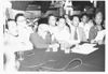 Aan de conferentietafel een deel van de Indonesische delegatie aan boord van de U.S.S. "Renville", Tg. Priok, van links naar rechts: Mr. Achmad Soebandjo, Hadji Agoes Salim, dr. J. Leimena en Sewaka. NI 8039