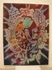 Modern batikschilderij met de voorstelling: 'Redt de bossen en de vogels'. Het schilderij is veelkeurig met 'fluoriserende' kleuren tegen een donkerrode achtergrond.