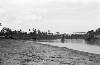 Een zwart-wit glasnegatief van brug en een deel van een oever met boten op het water en lage gebouwen onder bomen te Sigli in het regentschap Pidie in Aceh. Over de brug loopt een geüniformeerde man. Mogelijk is dit de brug bij de riviermonding te Sigli.