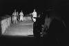 Een zwart-wit glasdia van het leggen van het fundament van een brug. Op de voorgrond een geïmproviseerde smalle brug waarover mensen lopen. Op de achtergrond de aanleg van de versterkte wallekant als fundament voor een brug. Rechtsonder een rond stickertje van de heer Kooij zelf, met bijna vergaan opschrift: Sopp.W