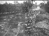 Zwart-wit stereofoto met de afbeelding van een brug door het oerwoud over een snel stromend riviertje met veel rotsblokken. op de brug staan een aantal mensen naar de rivier te kijken.