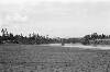 Een zwart-wit glasnegatief van een water met boten en twee bruggen, waaronder een ophaalbrug. Langs de oevers tropische vegetatie. Op de voorgrond een stapel hout.