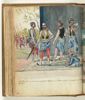 Kleurtekening van op de voorgrond de generaal en de officieren en op de achtergrond de soldaten van de VOC-hulptroepen te Batavia. Met opschrift. Onderdeel uit het schetsboek van Jan Brandes, dl. 2 (1808), p. 98.