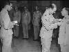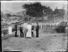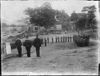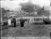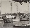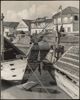 Een kalender bevestigd aan een gedecoreerde band van wit katoen. Op de stof is met verf een typisch Hollands tafereel afgebeeld. Vooraan staat een meisje met twee blonde vlechten en gekleed in traditonele klederdracht met een bos tulpen in haar hand. Achter haar rijen bloemenvelden, een kanaal met een houten brug erover, knotwilgen, een molen en een boerderij. Beide korte zijden van de stof zijn afgewerkt met rood garen ...