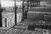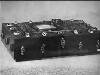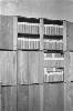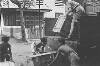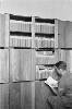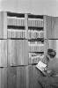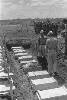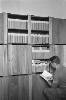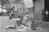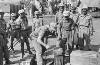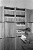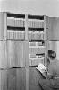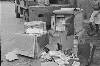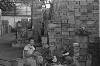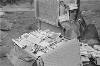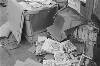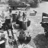 'Vierkante kisten conferentie bij Arnhemia'. Zes officieren en onderofficieren bespreken in het veldkwartier de situatie met behulp van stafkaarten. Ze zitten op een aantal kisten. De tweede officier van rechts heeft een map met een kaart van het operatiegebied en daarop nog een zogeheten berichtenblok, op zijn knieƫn liggen. In het midden is nog net een een deel van een schrijfmachine zichtbaar. Vijf van deze militairen ...