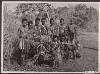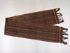 Lendendoek voor krijgers. Scheringikat, handgesponnen katoen, plantaardige verving in verschillende tinten indigo blauw en bruin. Afwerking korte zijden randje in ...techniek van 4draads getwijnd katoen (wit, okergeel en zwart). Onafgewekte franjes. Motieven: 3 brede banen ikat (wit en blauw op bruinen achtergrond), afgewisseld met streepbanen lichtblauw/wit en bruin/wit ikat omlijnd met blauwzwarte strepen op een bruine ...