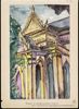 Een aquarel met de afbeelding van een Boeddhistisch tempelfront.