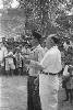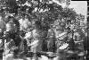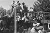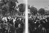 Een menigte Europeanen en Indonesiërs, voorzien van spandoeken en andere aanhankelijkheidsbetuigingen van o.a. de L.B.D. en de Hulppolitie tegen de bezetting van Nederland door Duitsland, wordt op Koninginnedag toegesproken.