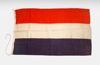 Een Nederlandse vlag die de gehele Japanse bezettingstijd buiten de Japanse interneringskampen is bewaard. De Nederlandse vlag is machinaal gemaakt van een fijne opengewerkte wollen stof met aan één kant een wit linnen baan waardoor een wit koord is gehaald en is vastgezet.