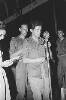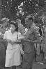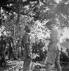 een Nederlandse officier spreekt met een KNIL-sergeant en schrijft iets in een notitieboekje, op de achtergrond KNIL-militairen en Indonesische burgers die gezamenlijk bamboe muziekinstrumenten maken