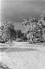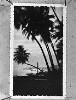 Nederlands Indië Limburgse Jagers; palmbomen, kazerne tekst achter op foto: onder Borneo's palmen Sanga ' Sanga 1947 Borneo. Op de achtergrond de kazerne L.H. Rutten