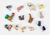 Veertien stoffen dierenfiguren: een giraffe, twee konijnen, een kat(?), drie gele en twee blauwe kuikens, een kip en een haan, een olifant en twee honden. Alle, op het grijze konijntje na, zijn gemaakt door de moeder van Ciska Feekes.