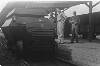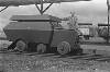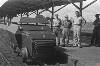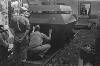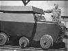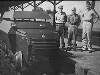 De omgebouwde en van pantsering voorziene railjeep, bestemd voor treincontrole en baanvakbeveiliging, geconstrueerd door de ZSS-werkplaatsen te Lahat, op aanwijzing van de LSD kolonel Mollinger, poseert met twee van de talrijke medewerkers. Met Bosman uit Den Haag en korporaal Jasper Geenjaar uit Roermond.