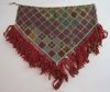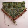 Schaamgordel voor mannen, bestaande uit een ovale band van stevige bruine boombast, omkleed met beschilderde fuya, opgenaaid met naturelkleurig vezeltouw. Lang afhangende slippen van verschillende breedten, gezoomd in zigzagsteek. Op de overgang omwikkeling met blauw (of verschoten groen) touw (of katoen). Motieven: één grote en twee kleinere zonnerad motieven (in blauw, bruin en geel), idem een op de slippen.