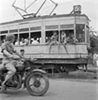 Tram met propagandatekst voor een onafhankelijk Indonesië. Tram 2 (rijdend tussen Amsterdamse Poort en Menteng in Batavia / Jakarta) van de Bataviasche Verkeers-Maatschappij (BVM) (vanaf oktober 1945 Tram Djakarta Kota) met opschriften 'Better to hell than to be colonised again' (‘Beter naar de hel dan weer gekoloniseerd te worden') en 'Respect our red and white flag', eind september 1945. NI 9474