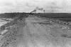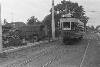 De electrische tram nr. 1 op de Mataramweg in Batavia, gezien richting Meester Cornelis. Op de achtergrond het spoorwegviaduct