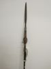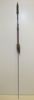 Zeer smalle ijzeren lanspunt op een korte, geringde steel, overgaand in een smalle, ijzeren steelring. De schacht is dik en van zwart hout, met een ijzeren, afgeplatte punt.