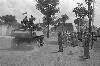 Nederlandse troepen vertrekken. Een rupsvoertuig passeert een groep Nederlandse officieren, waaronder generaal-majoor Baay?