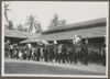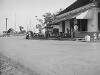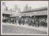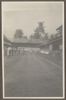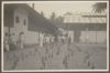 Kampili (Zuid-Celebes). Wedstrijden op 31 aug. 1945. Op de achtergrond van r. naar l.: de gehavende steenen polikliniek, de idem naaikamer, de herbouwde 2e 'gedek'-naaikamer, daarvoor een overdekte schuilloopgraaf met afdakjes boven de toegangen, geheel links geraamte van de te herbouwen eetzaal Complex B. NI 9133